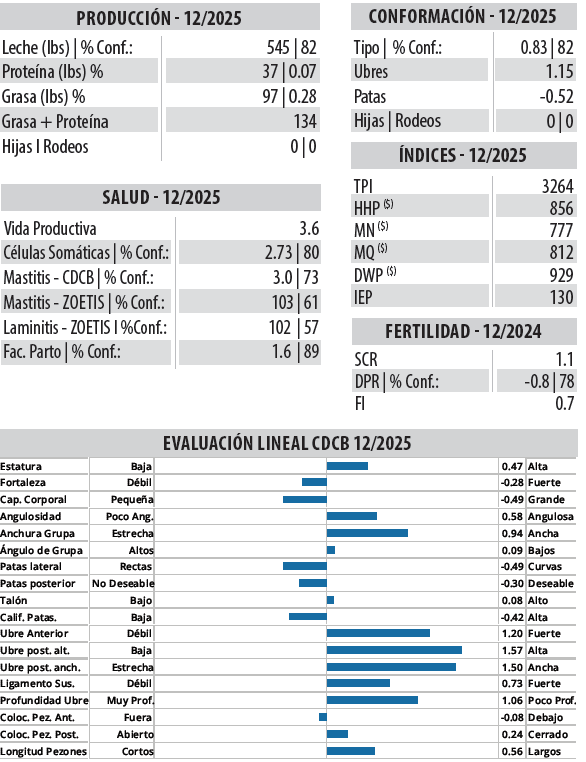 Producirá hijas con altos sólidos y buenas ubres con pezones largos.
